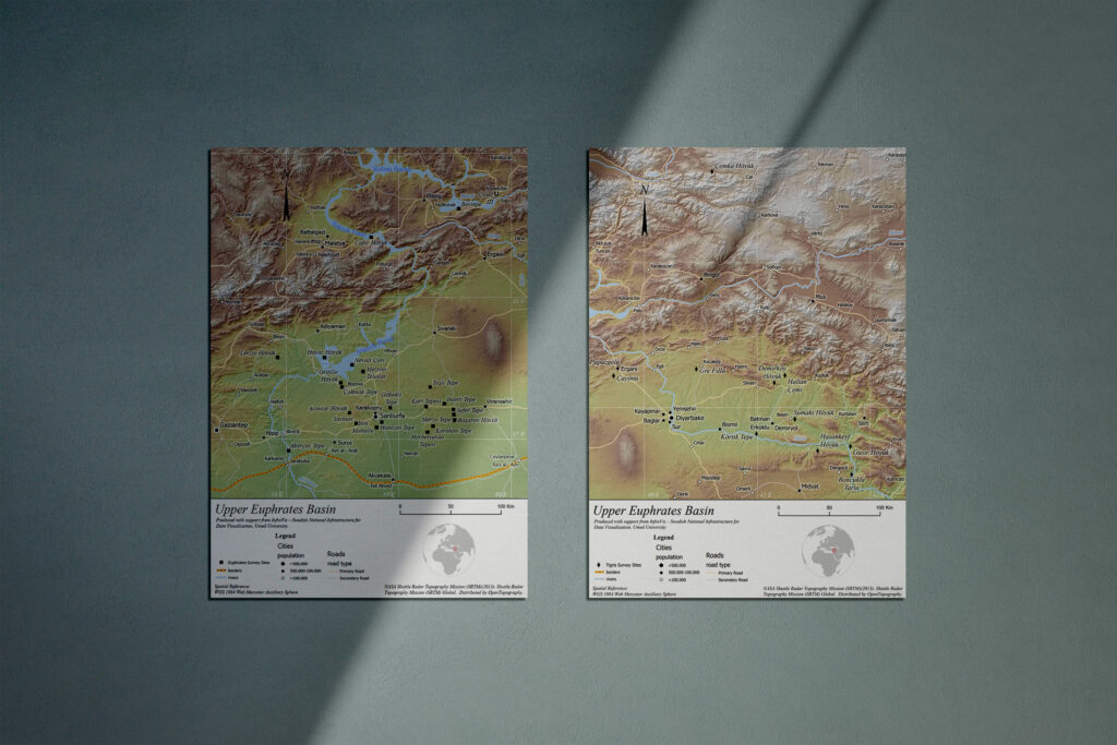 The project’s primary objective was to develop a GIS-based visualization (printed maps) of archaeological sites located in the Upper Tigris and Euphrates River basins. The work reveals the transition from hunting-gathering to farming lifeways in this region. The visualization aims to integrate archaeological, environmental, and material culture data to provide a spatial understanding of human-environment interactions during this significant cultural shift. Data on case study sites locations on the South Levant area and Cyprus were also visualized. Additionally, diagrams demonstrating the chronological placement of the material culture on three case study locations in the Upper Tigris River basin were created.